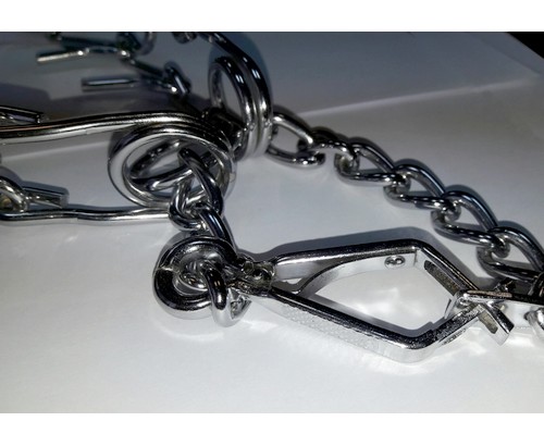 Oba końce właściwej obroży połączone są dodatkowo łańcuszkiem zaciskowym potęgującym efekt szkoleniowy.