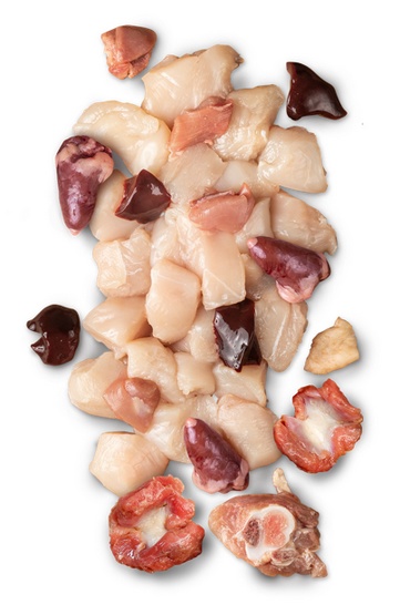 68,0% kurczak (mięso, serce, wątróbka, żołądek); 31,0% wywar; 1,0% minerały