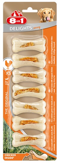 8in1 Delights XS Kości do żucia z mięsem z kurczaka — oryginalna receptura. Pyszne mięso z kurczaka zawinięte w twardą wołową skórę wysokiej jakości — wyjątkowe połączenie kości do żucia i nagrody…