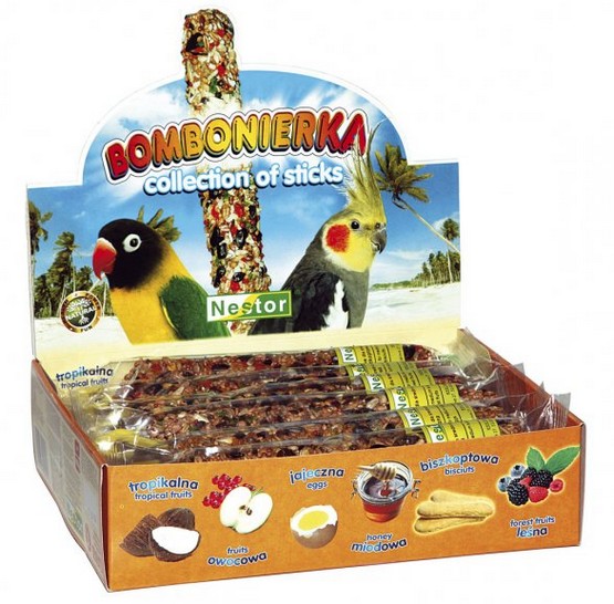 Bombonierka dla średnich papug to zestaw 12 kolb w 6 smakach: