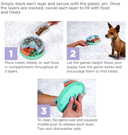 Gra Lickin Layers Puppy zachęca do swobodnej zabawy w poszukiwanie smakołyków! Zacznij od napełnienia przegródek przysmakami lub suchą karmą. Potem zachęć pupila do eksploracji zabawki.