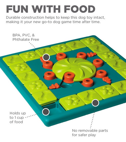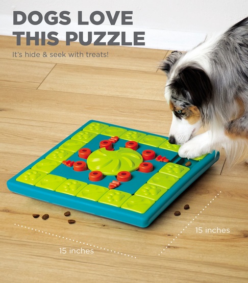 Węsząc i pomagając sobie łapą lub pyszczkiem pies natrafi na przegródki, które będzie musiał odblokować, zanim sięgnie po ukryte w nich łakocie. System blokady polega na przesuwaniu ruchomych płytek znajdujących się na brzegach zabawki. Dodatkowo na środku jest obrotowe pokrętło z wnęką pasującą do okrągłych elementów również skrywających łakocie. Sprawdź czy Twój czworonóg jest geniuszem nad geniusze!