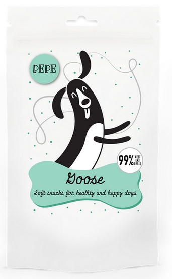 PAKA ZWIERZAKA PEPE Mini Chunkies Goose – gęś Małe, miękkie kawałki 8 x 8 mm wykonane ze świeżo przygotowanego mięsa gęsi oraz gęsich podrobów. Mięso pochodzi z europejskiej produkcji (hodowli…