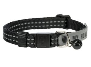 Obroża dla kotów. Jest w pełni regulowana. Dołączony dzwoneczek i plakietka adresowa mocowana na klips. Elementy odblaskowe Różne kolory – wysyłane losowo. Szybkie zapięcie