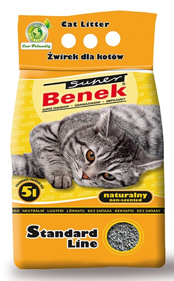 Super Benek Naturalny to popularny żwirek higieniczny dla kotów, a także innych większych zwierząt domowych (królik, świnka morska).
