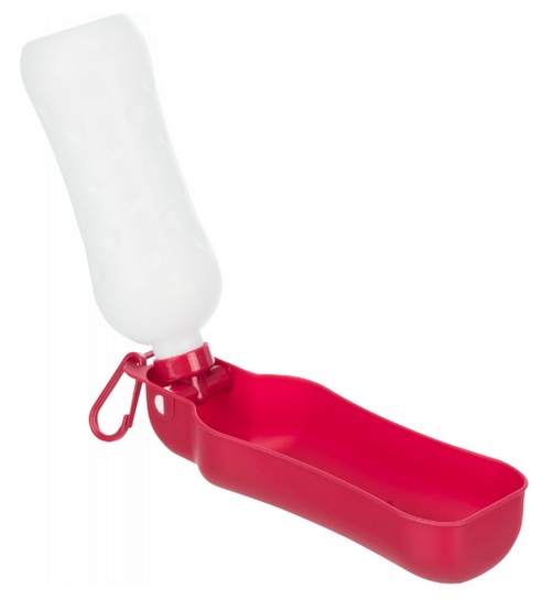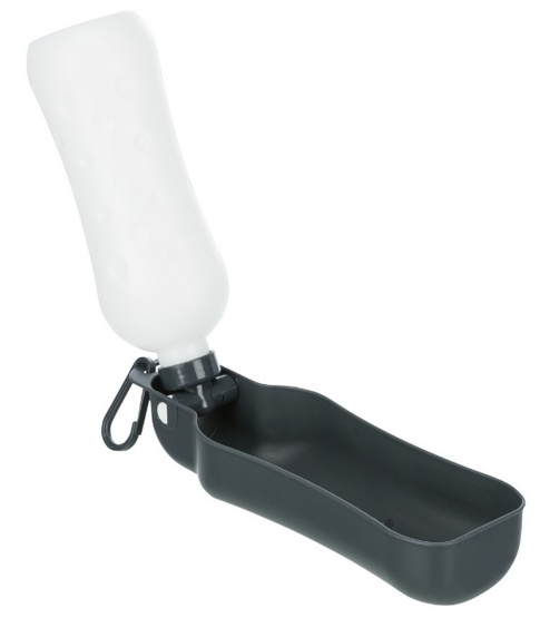 W czasie podróży również należy zapewnić psu dostęp do świeżej wody. Bidon z miską idealnie się do tego celu nadaje, gdyż pozwala na wygodny transport i podawanie wody. Doskonały na spacery i dłuższe podróże – może być transportowany na dwa sposoby: haczyk i odpinany pasek na ramię.