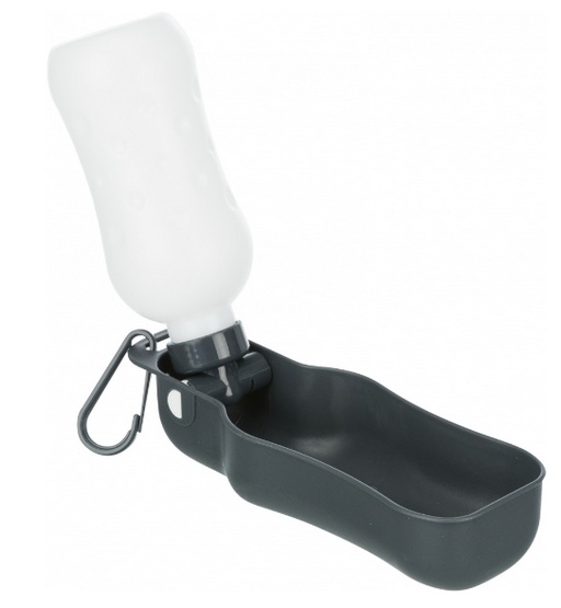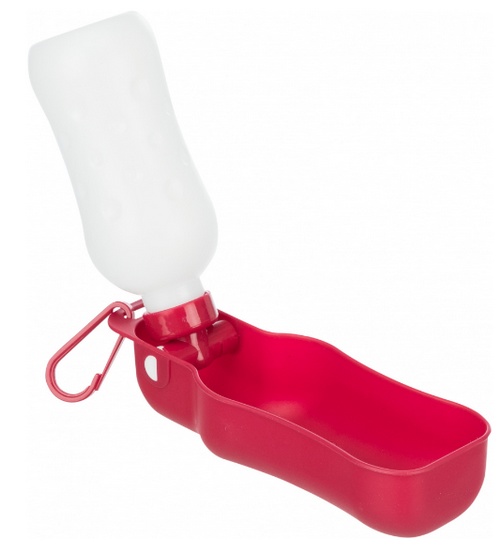 W czasie podróży również należy zapewnić psu dostęp do świeżej wody. Bidon z miską idealnie się do tego celu nadaje, gdyż pozwala na wygodny transport i podawanie wody. Doskonały na spacery i dłuższe podróże – może być transportowany na dwa sposoby: haczyk i odpinany pasek na ramię.