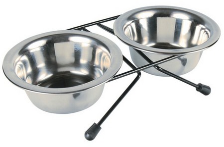 Praktyczny zestaw misek na stojaku, pozwalający na wygodniejszy dostęp do karmy. Stojak na antypoślizgowych nóżkach Pojemność 0,2L Średnica 10 cm Stal nierdzewna