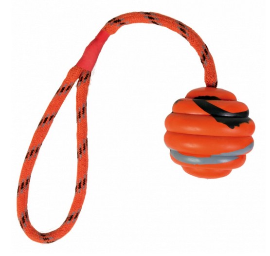Piłka kauczukowa z przymocowanym sznurem. Średnica piłki 6 cm, długość liny 30 cm. Zabawka idealna do rzucania, aportowania, przeciągania siłowego.