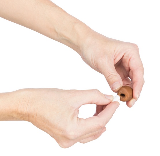 Opracowany we współpracy z weterynarzami przysmak dla psów ma mały otwór, do którego można bez wysiłku wepchnąć tabletkę. Ponieważ przekąska jest miękka, otwór łatwo się zamyka, a tabletka nie jest już widoczna. Twój pies otrzyma swój smaczny przysmak, jednocześnie bez problemów połykając tabletkę.
